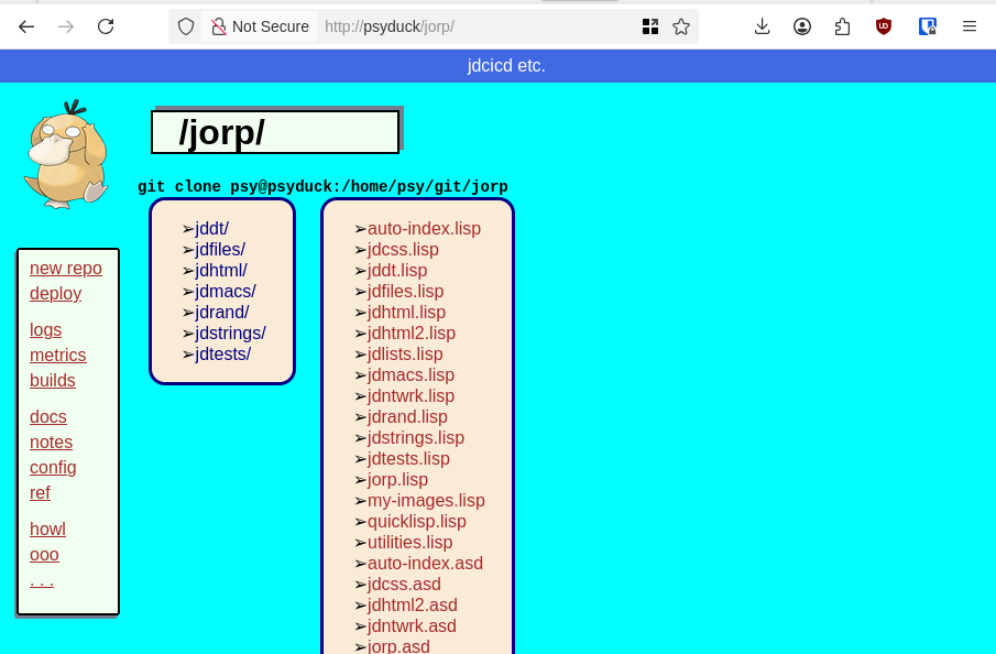 i use a lisp-implemented auto-indexer i wrote to create an interactive file server for the files i wish to display. this is heavily influenced by nginx's autoindex functionality. selecting a directory (on the center left) will open a new page with its contents. selecting a file (on the right) will simply display the raw text of the file in the browser.